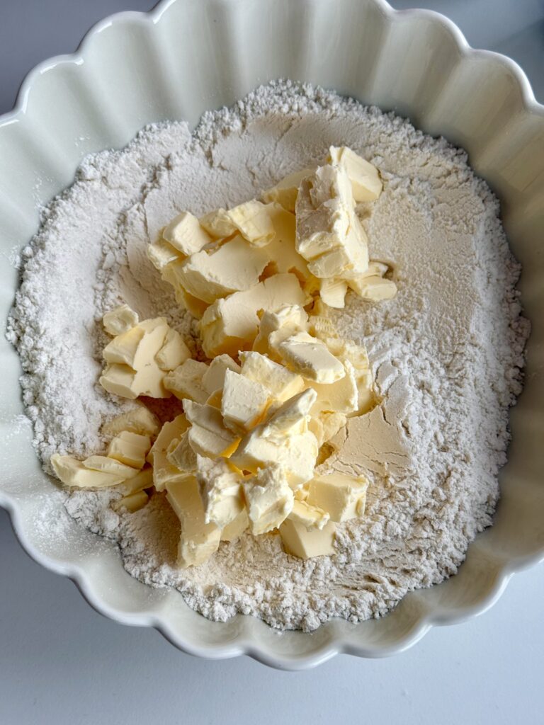 Make the pastry: In a large bowl, whisk together the flour, salt, and sugar. Add the cold, cubed butter and use your hands or a pastry cutter to work it into the flour until the mixture looks like coarse crumbs with pea-sized butter pieces. Slowly add the ice water, a little at a time, and mix until a dough just comes together. Don’t overwork it. Form the dough into a disk, wrap in plastic wrap, and refrigerate for at least 30 minutes.
