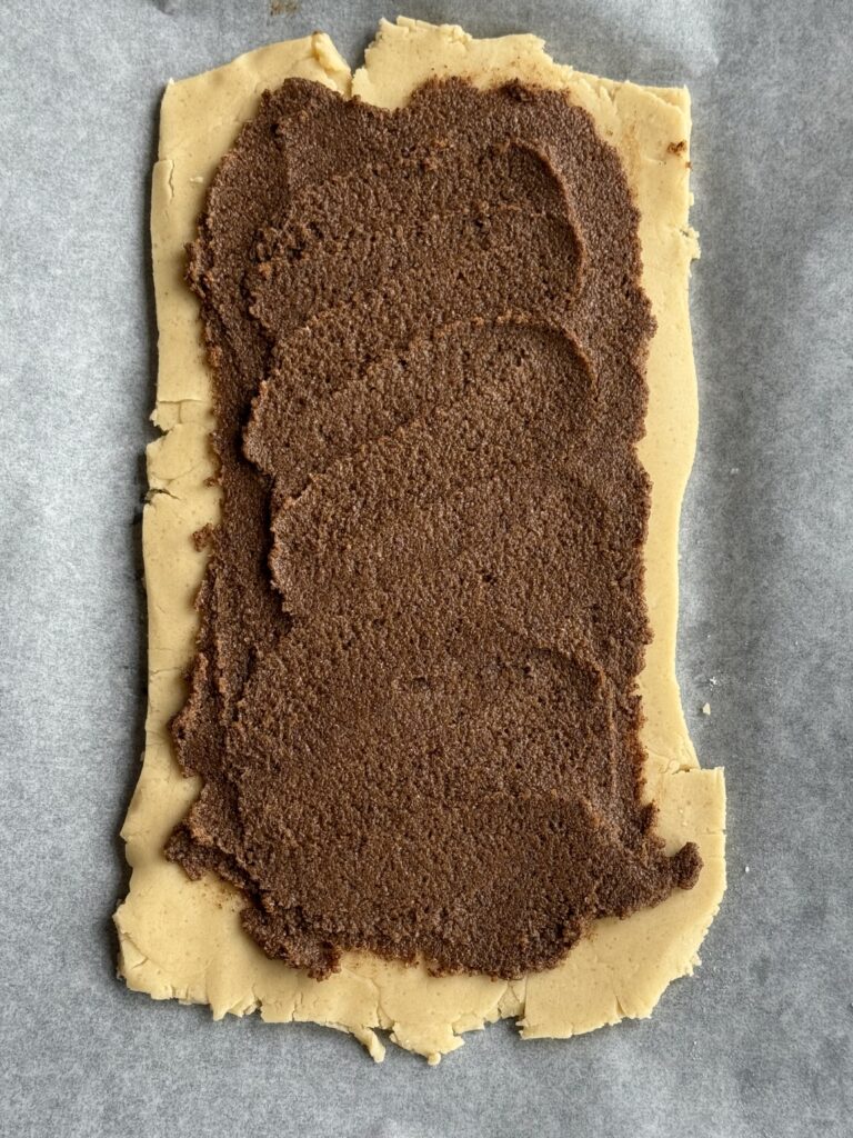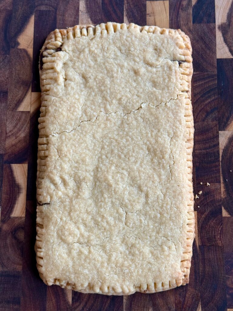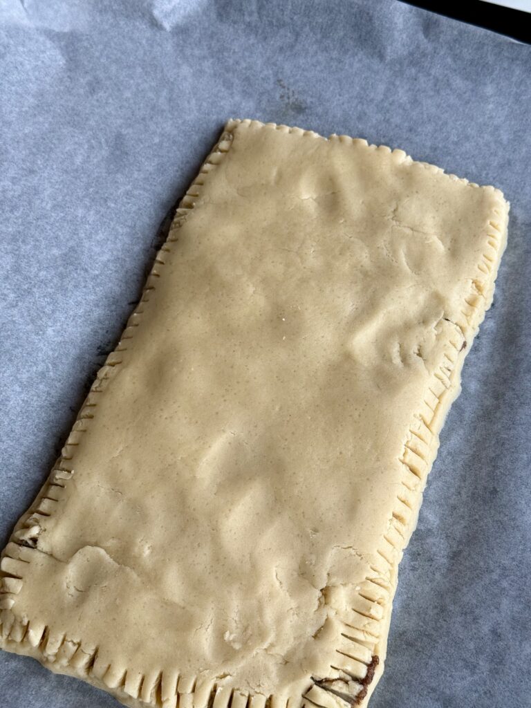 Assemble the pop tart: Preheat the oven to 190°C / 375°F and line a baking sheet with parchment paper. Cut the chilled dough into two, and roll out on a lightly floured surface into a rectangle about 0.5 cm (¼ inch) thick. Spread the filling evenly over the dough. And place the other dough piece on top. Then use a fork to close the edges of the poptart.
