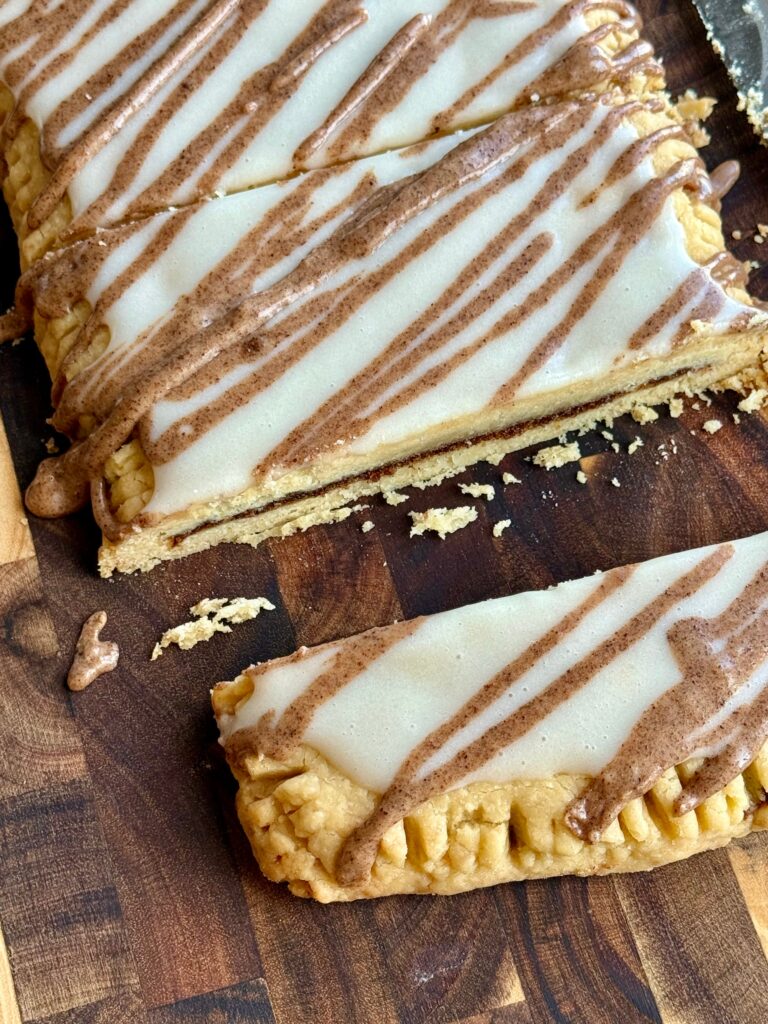 Make the glaze: In a small bowl, combine together powdered sugar, milk until smooth. Adjust the milk for desired consistency. Drizzle the glaze over the cooled pastry. Save about 2 tbsp of the glaze and add cinnamon, drizzle this on top. Top with candied walnuts!