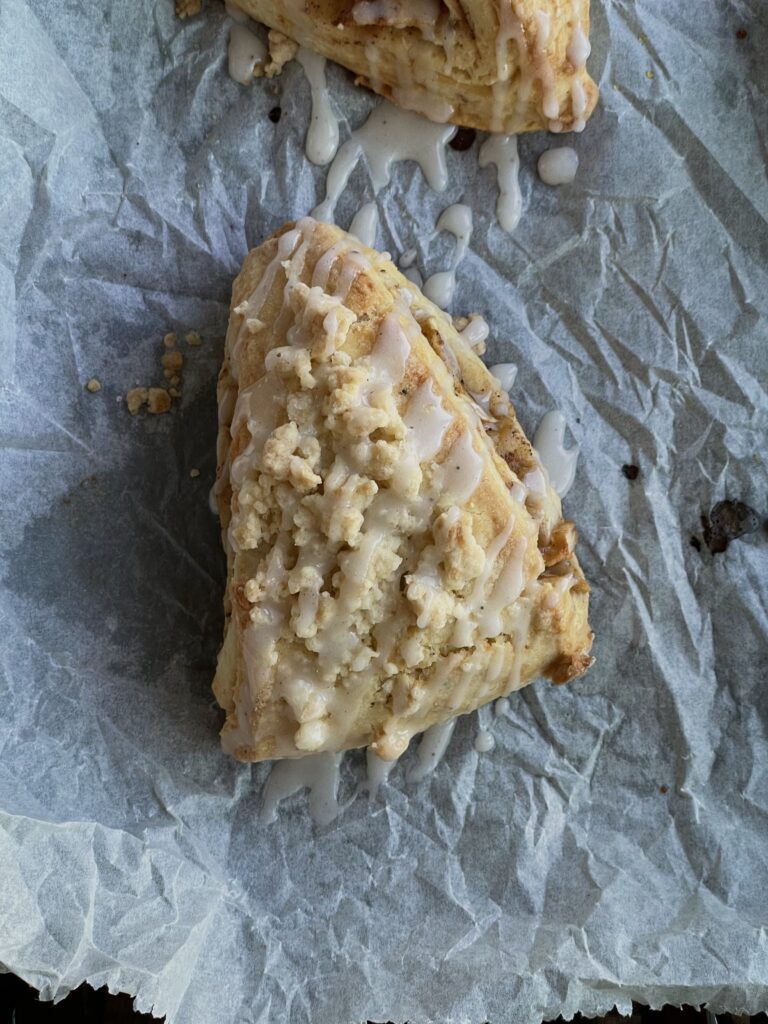 Bake Place triangles on the prepared baking sheet. Brush tops with buttermilk, sprinkle with coarse sugar, and scatter the strudel crumbs over. Freeze for 15 minutes while preheating the oven to 200°C (400°F). Bake for 20–25 minutes, or until golden brown and crisp on top.