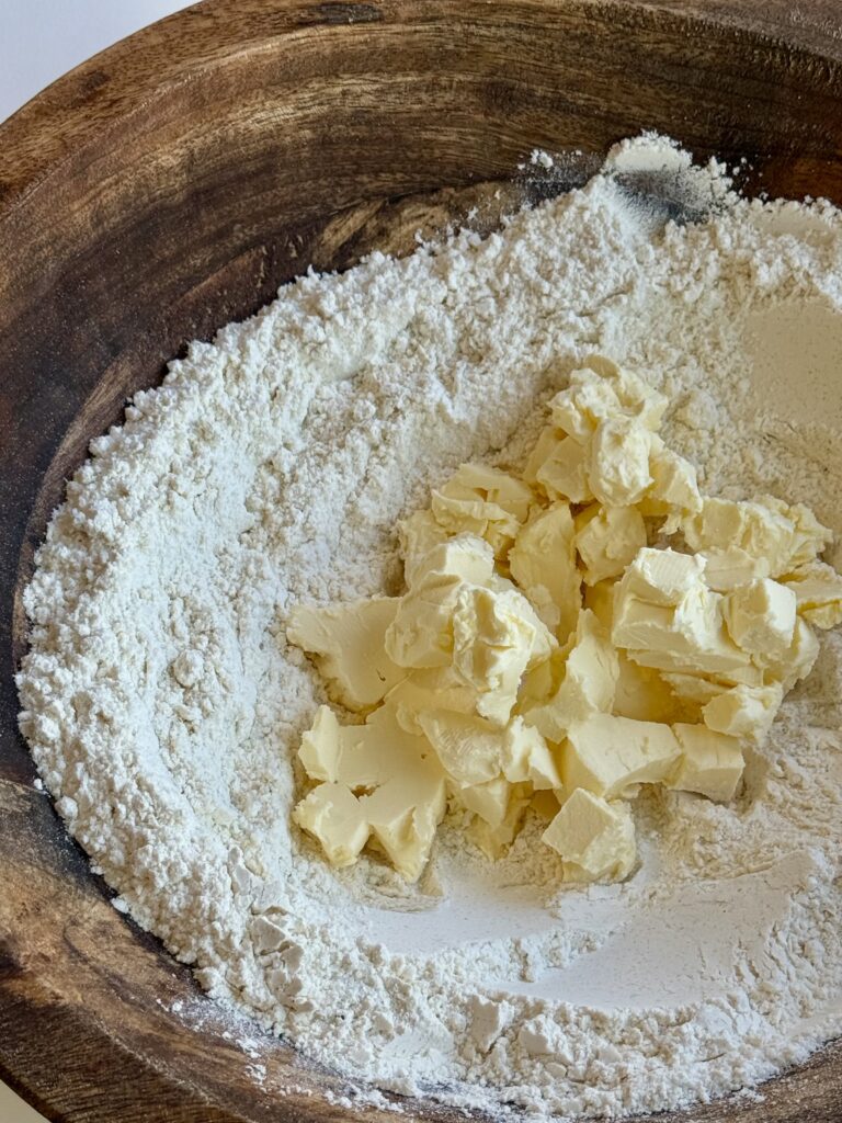 Start the scone dough Line a large baking sheet with parchment paper. In a large bowl, whisk together the flour, cane sugar, baking powder, and salt. Grate the frozen butter on the large holes of a box grater. Toss into the flour until the mixture resembles coarse crumbs.
