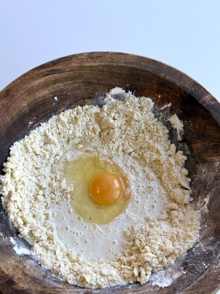 Add wet ingredients In a medium bowl, whisk together buttermilk, egg, and vanilla. Pour over the flour mixture. Use a spatula to mix until a shaggy dough forms. Knead lightly with your hands until just combined (dough should be soft, not sticky).