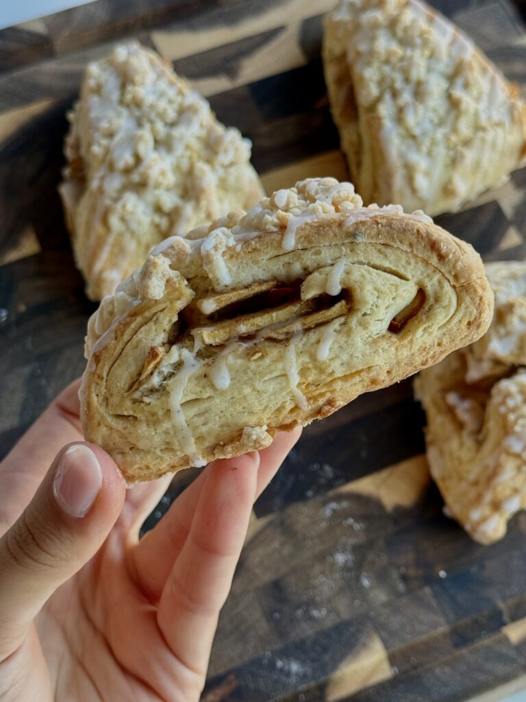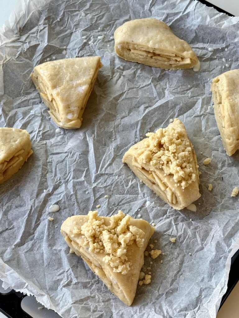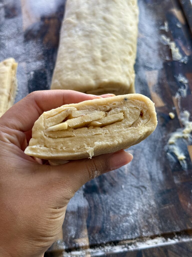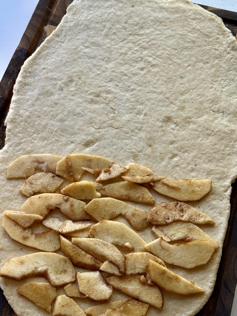 Shape with apple filling Transfer dough to a lightly floured surface and roll into a rectangle about 1 cm (½ inch) thick. Spread the apple slices evenly over the dough. Gently roll it up from the long side into a log, then flatten slightly. Cut into triangles (like scone wedges).